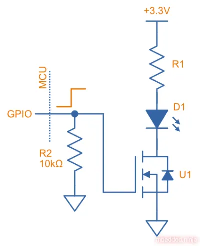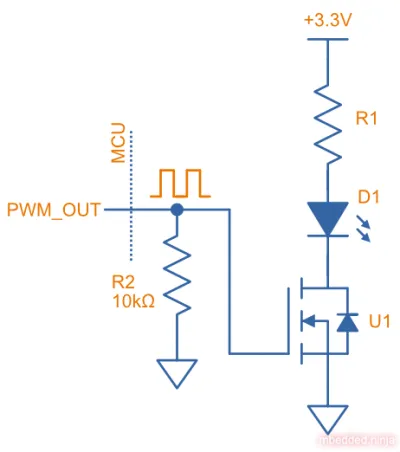 The below image shows how you can do this. The MOSFET U1 has been added so that the LED can be driven with currents higher than the maximum specified by the microcontroller’s GPIO pin (which is normally in the 1-20mA range, check the datasheet of the MCU!). You could omit this MOSFET (and the  resistor R2) and just drive the LED directly if the MCU can supply the required current directly.