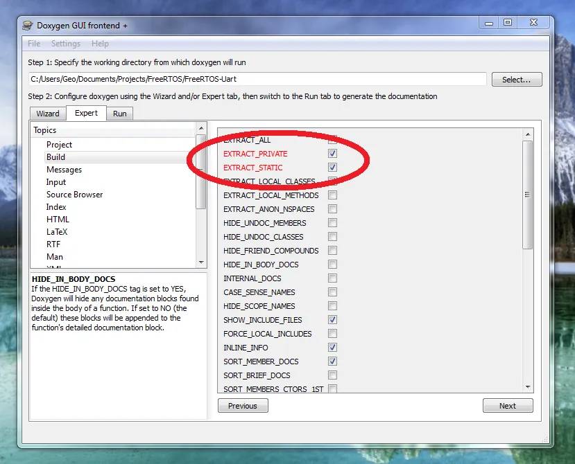 Doxywizard is a Windows GUI for using Doxygen. Setting EXTRACT_PRIVATE = 1 and EXTRACT_STATIC = 1 results in doxygen including all commented objects into the documentation, not just the ones that it deems public or accessible from other files (static). I find this to be much more useful than to exclude them, as without these objects present in the documentation it can leave the reader wondering how on earth your code works (C doesn’t have the nice public interface structure that object orientated programming has). The following picture shows the two options selected when using the Doxygen GUI (Doxywizard).