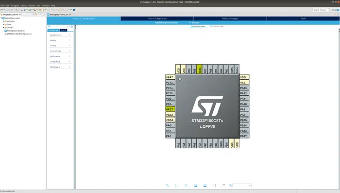 <root_project_dir>  |-- Core  |   |-- Inc                    Contains the user header files.  |   |-- Src                    Contains the user source code.  |   |-- Startup  |-- Debug                     Default directory for debug build artifacts.  |-- Drivers  |-- .cproject  |-- .mxproject  |-- .project  |-- <project_name>.ioc        Contains the pinout and hardware configuration of the micro.  |-- <micro_name>_FLASH.ld     This is the linker script for the micro.The .ioc File