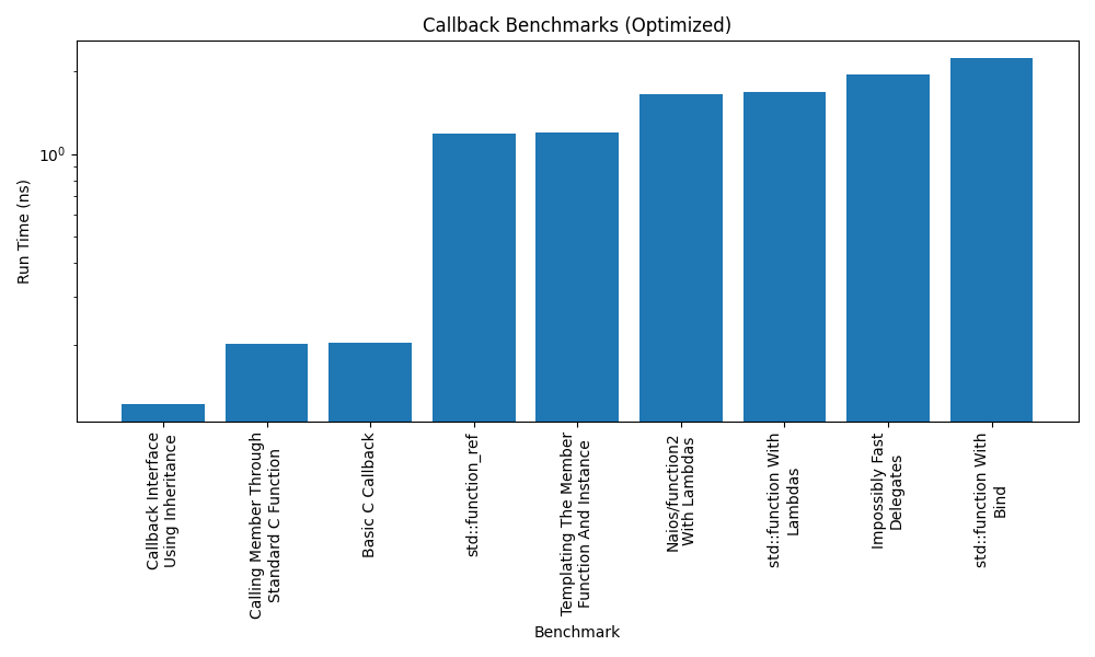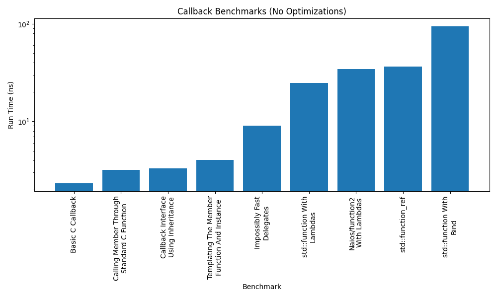 I benchmarked some of the different callback techniques above to compare how quickly they run. Most of the time you wouldn’t care about these performance differences, as the callbacks are not part of some critical execution path. However, in certain situations you will care! Some examples might be if you had a callback that fired on every received byte of a high bandwidth communication protocol, or a callback as part of some fast running control loop.