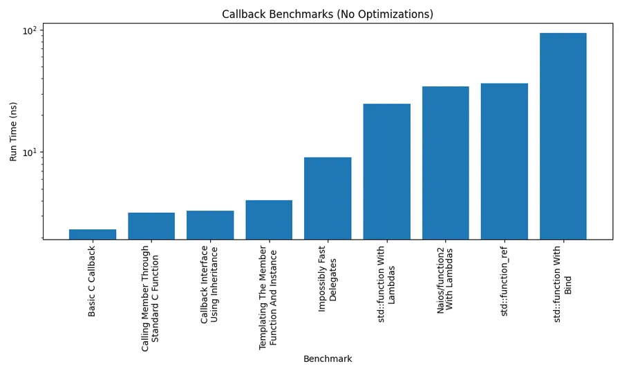 There is a somewhat famous 2005 article called “The Impossibly Fast C++ Delegates” by Sergey Ryazanov that describes code for invoking pointer-to-member functions in a fast way that does not require any dynamic memory allocation.2 Then in 2012 there was a post on the Code Review Stack Exchange that modernised the code for C++11.3 Let’s see how this approach compares to std::function!