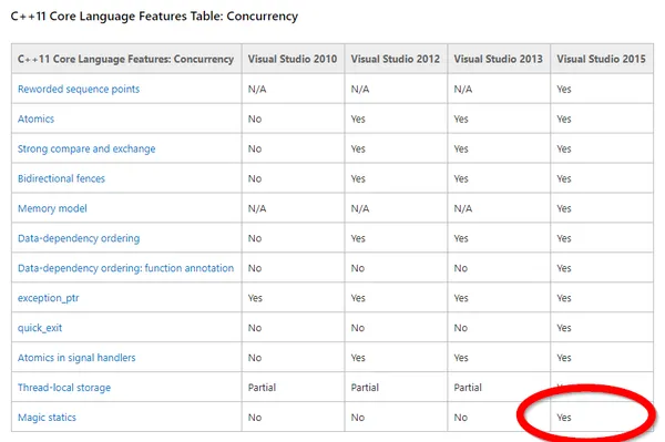 On the Windows side of things, thread safety was implemented for magic statics in Visual Studio 2015.