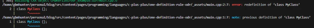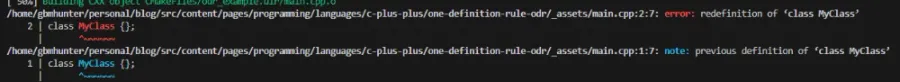 class MyClass {};class MyClass {}; // Illegal!While this is illegal, it is not normally a problem since the compiler can easily detect this and give you an error (I tested this with GCC v11.4.0, see This is a placeholder for the reference: fig-multiple-definitions-in-one-file-error). Header guards protect the same header file (and thus the same class) from being defined multiple times in the same translation unit (header guards also do useful things like preventing infinite re-inclusion).
