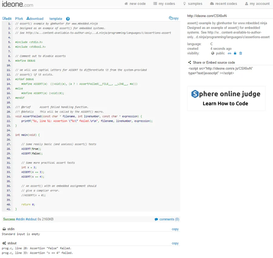 main: ./main.c:4: int main(void): Assertion `0 == 1' failed.With clever use of the && operator you can add a custom message to this assert like so: