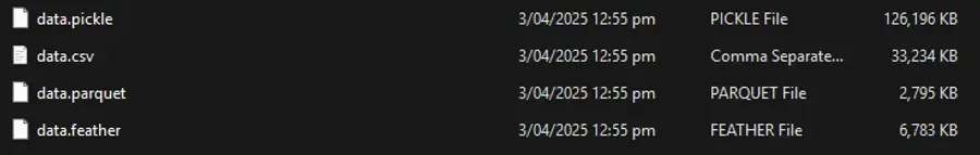 For large datasets, CSV files might become too large and slow to save and load. Pandas also supports a number of other file formats/serialization protocols, including pickle (Python’s built-in serialization protocol), Feather and Parquet.