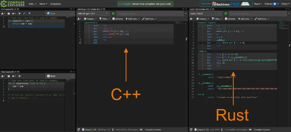 When compiled without the --release option, Rust will also perform overflow checking when doing mathematical operations such as add and multiply. We can see this if we use the Godbolt Compiler Explorer and compare the assembly output of a simple square() function in both C++ and Rust: