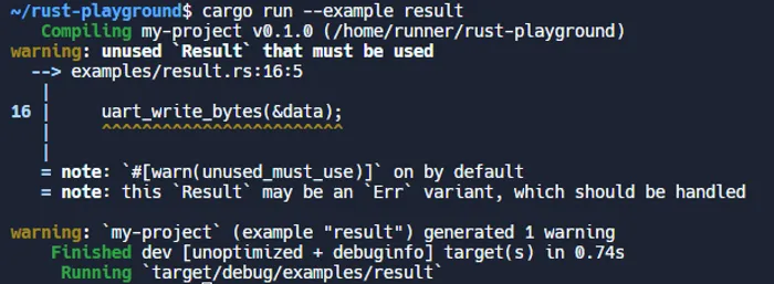 let data = [32, 38, 24, 34];uart_write_bytes(&data); // Oh oh, we've forgotten to check for an errorRust will spit out: