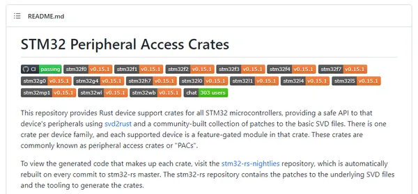 - Peripheral Access Crates (PACs): Contains the minimal naming of memory-mapped registers that control microcontroller peripherals.