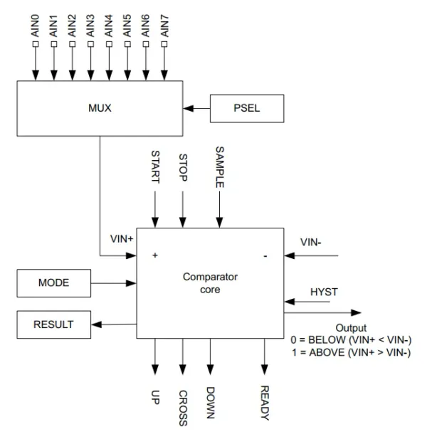 The nRF52 series MCUs have a comparator peripheral called COMP. Much like discrete analogue comparator ICs, this peripheral can be used to compare one input voltage (VIN+) against another input voltage (VIN-), and can generate events (e.g. raise an interrupt) depending on the result (whether it is higher or lower than the other). VIN+ can be any of the analog input pins AIN0-AIN7. VIN- can be any of the analog input pins (differential mode) or from VREF, which in turn can be derived from VDD, AIN0-AIN7, or internal 1.2V, 1.8V or 2.4V references. It’s internal block diagram is shown in This is a placeholder for the reference: fig-comparator-diagram-nrf52.