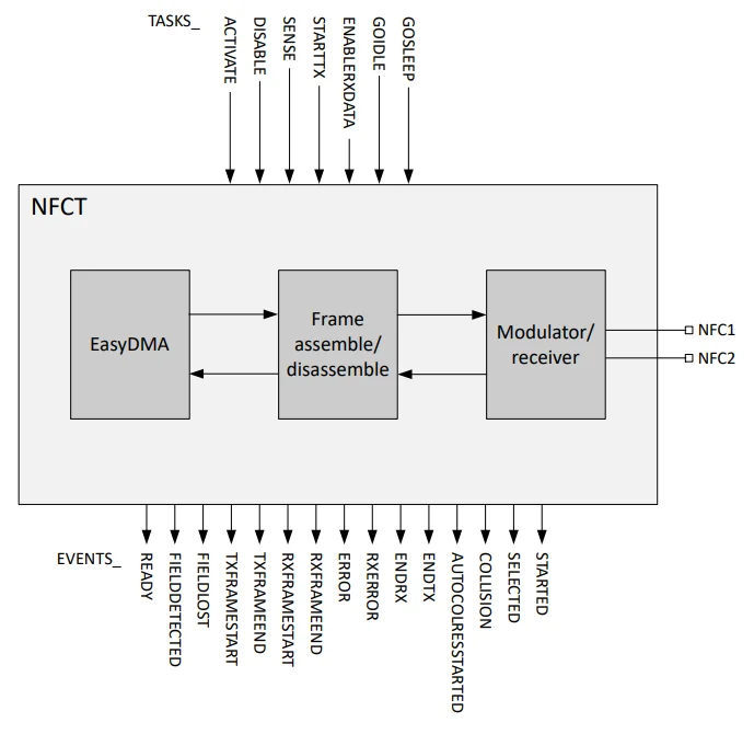 The NFCT peripheral uses EasyDMA for the reading and writing of data packets to and from RAM.