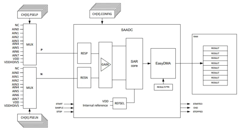 SAADC uses EasyDMA to write conversion results to RAM memory.