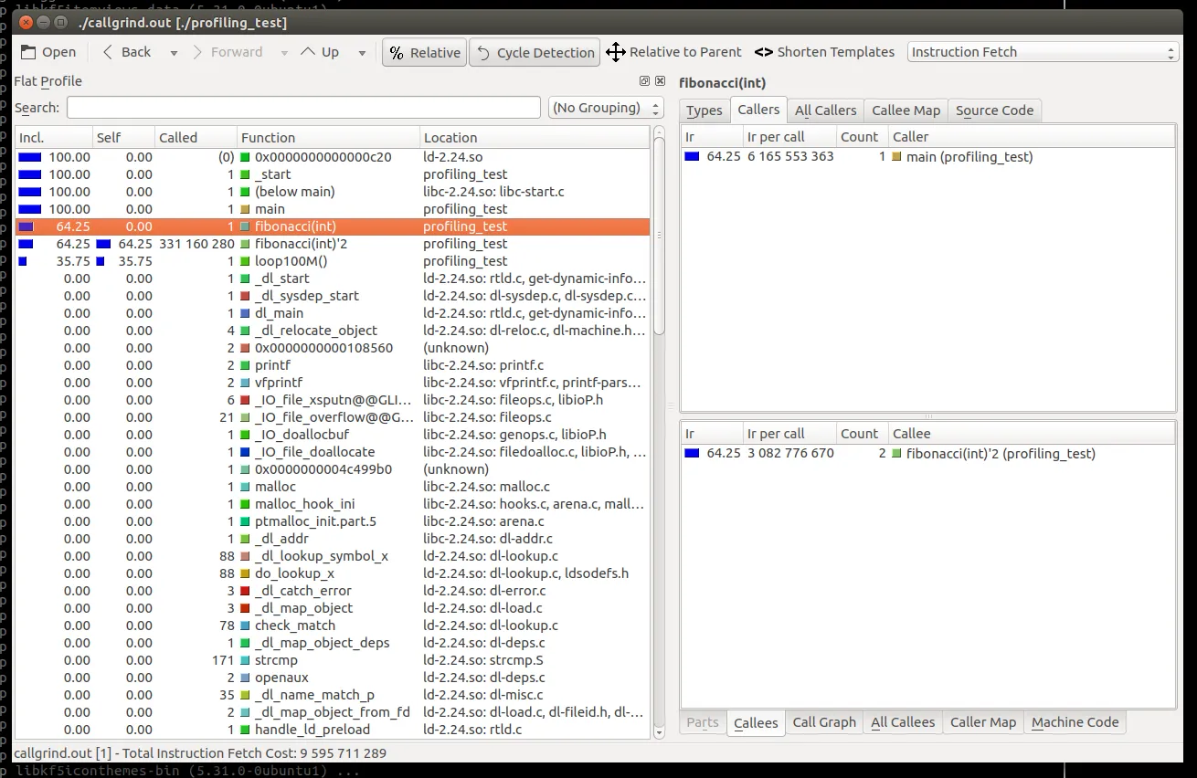 However, this text can be hard to analyze! Thankfully, there is a visual tool called kcachegrind which can create visual graphs from the callgrind output (yes, kCACHEgrind can display the results of CALLgrind). kcachegrind can be installed on Ubuntu with: