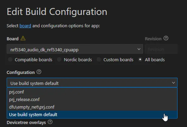 C:/project/zephyr/include/zephyr/device.h:83:41: error: '__device_dts_ord_DT_N_NODELABEL_hs_0_ORD'       undeclared (first use in this function)   83 | #define DEVICE_NAME_GET(dev_id) _CONCAT(__device_, dev_id)      |                                         ^~~~~~~~~If you are using the VS Code and the nRF Connect extension, sometimes this can be fixed by making when you setup the build configuration you set the Configuration to “Use build system default” as shown below: