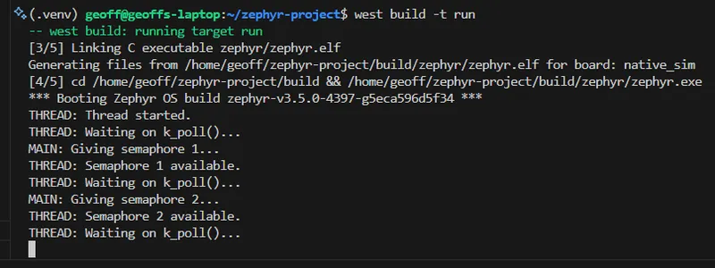 (.venv) geoff@geoffs-laptop:~/zephyr-project$ west build -b native_sim ./apps/hello-world/-- west build: generating a build systemCMake Warning at CMakeLists.txt:3 (find_package):  By not providing "FindZephyr.cmake" in CMAKE_MODULE_PATH this project has  asked CMake to find a package configuration file provided by "Zephyr", but  CMake did not find one.