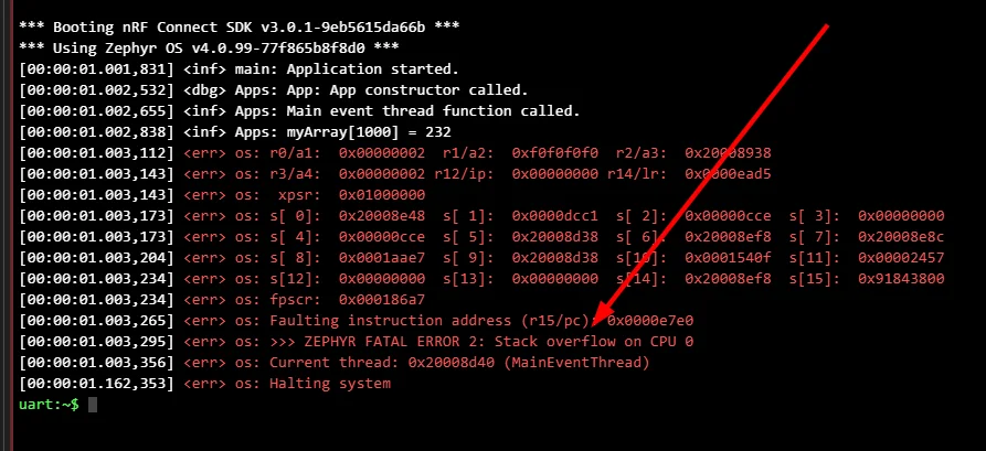 // Try and blow up the stackuint8_t myArray[2000];// Do something with it so it is not optimized outfor (size_t i = 0; i < 2000; i++){    myArray[i] = i;}LOG_INF("myArray[1000] = %d", myArray[1000]);