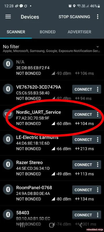 If you want to connect to this Bluetooth NUS shell peripheral from a computer, you can use the NinjaTerm terminal application. This supports Bluetooth LE as a connection type, and can auto-detect and listen to the popular Bluetooth serial service and characteristic UUIDs such as the Nordic UART Service (NUS).