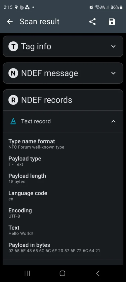 Likely the simplest example to get started is the NFC: Text record example. It configures a tag to expose a text record to NFC polling devices. The text says “Hello, World!” in three different languages.