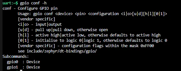 static void interruptCallback(const struct device* dev, struct gpio_callback* cb, gpio_port_pins_t pins){    // WARNING: This will be called in a interrupt context.    // CONTAINER_OF() won't give the "non-standard layout" warning now since `GpioCallbackDataAndObject` is a standard layout type.    GpioCallbackDataAndObject* gpioCallbackDataAndObject = CONTAINER_OF(cb, GpioCallbackDataAndObject, m_gpioCallbackData);    MyClass * obj = gpioCallbackDataAndObject->m_obj;    // Now we have the object, do something with it!}Configuring and Setting GPIO In the Shell