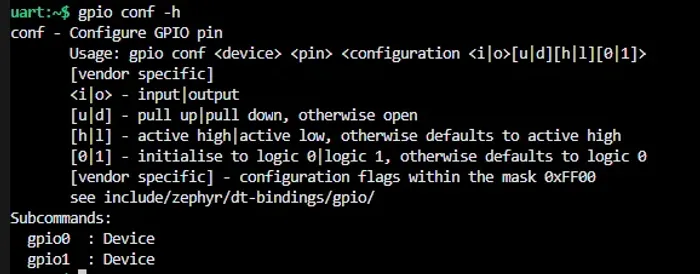 The latest documentation for peripherals (UART, SPI, PWM, PIN, e.t.c.) APIs can be found at https://docs.zephyrproject.org/latest/reference/peripherals/index.html. Some of Zephyr’s own documentation on drivers is great and teaches you by example, and other drivers are not so well written and you have to piece together code snippets littered all over the place. The automated Doxygen generation is pretty decent, but is only really useful once you know the basics — it doesn’t serve as a great intro in a driver’s API and how to use it.