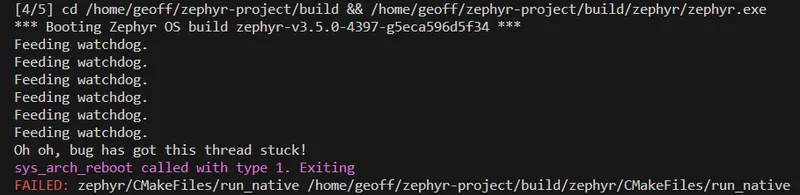 The following code is a complete example showing watchdog task functionality that can be built for the native_sim board (Linux). It sets the watchdog up with a 3s timeout. It feeds the watchdog once a second for 5 seconds, and then pretends there is a bug which locks up the code. The software watchdog successfully resets the device 3 seconds later.