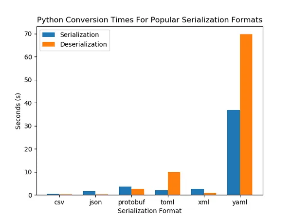 Being the only binary, non-human readable format that was compared, it’s with no surprise that protobuf is the most concise format. Closely behind protobuf was CSV. Because CSV does not support irregular, non-flat data structures, it only requires a value delimiter (e.g. ,) and end of line character (e.g. \n).