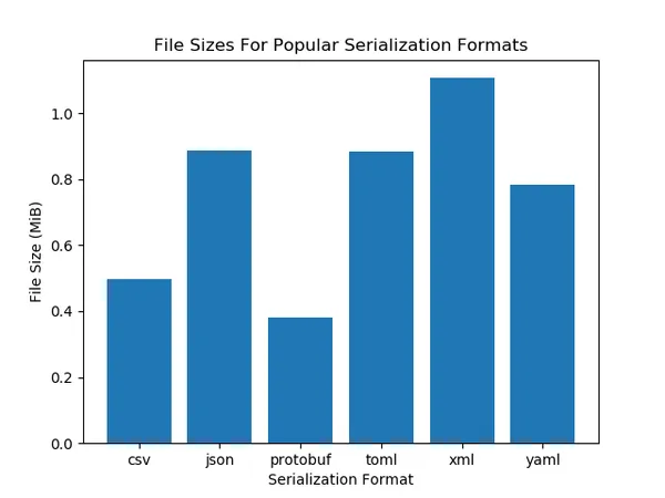 When serializing large amounts of data, another important aspect is the verbosity of the format. To compare the verbosity of the different formats, we can pass each format the same data, dump the data to disk, and compare the file sizes.