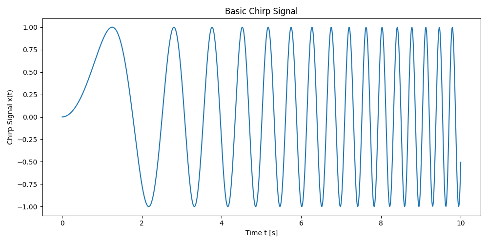 This is a placeholder for the reference: fig-basic-chirp-signal shows a plot of this basic chirp signal . This happens to be a linear chirp, in that the frequency increases linearly over time (more on this in the Linear Chirps section).