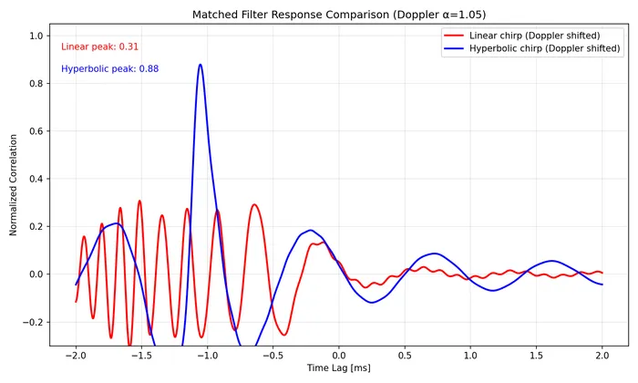 This is a placeholder for the reference: fig-doppler-matched-filter-comparison shows a side-by-side comparison of matched filter outputs for linear and hyperbolic chirps, both with and without Doppler shift (, representing approximately 5% time compression). The negative time lag for the peaks in the doppler shifted waveforms is due to the signal being compressed in time — the received signal “finishes early” and the correlation maximum shift to where the compressed signal best aligns with the original.