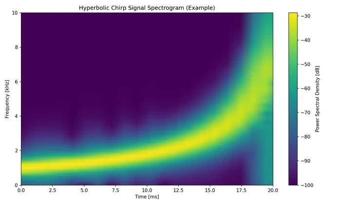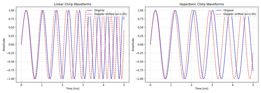 One of the most important properties of hyperbolic chirps is their Doppler tolerance. In radar and sonar systems, when a signal reflects off a moving target, the received signal undergoes a Doppler shift. This shift not only changes the frequency content but also compresses or stretches the signal in time.