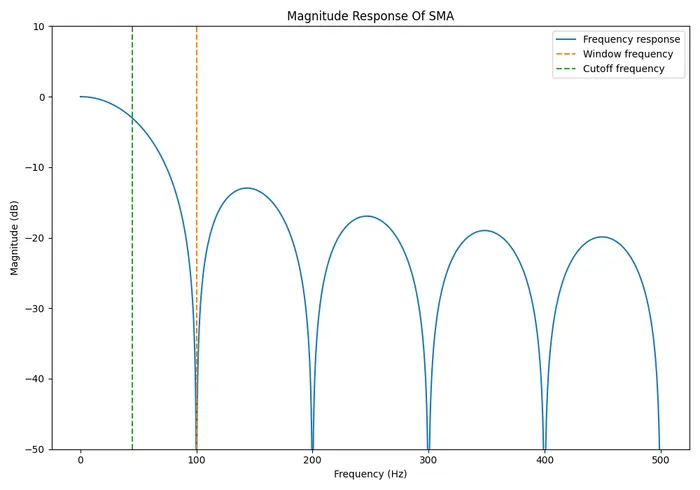 Lets design a SMA filter with a sampling rate of and a window size of . This gives the following magnitude response: