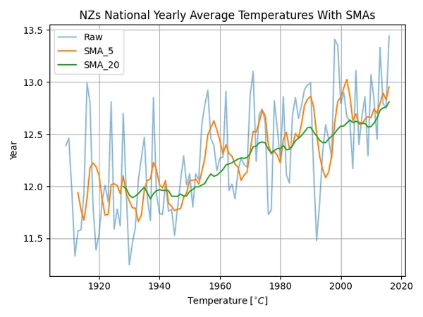 The following plot shows the effect of a SMA filter. The data used is New Zealand’s national average temperature (data from https://data.mfe.govt.nz/table/89453-new-zealands-national-temperature-19092016/):