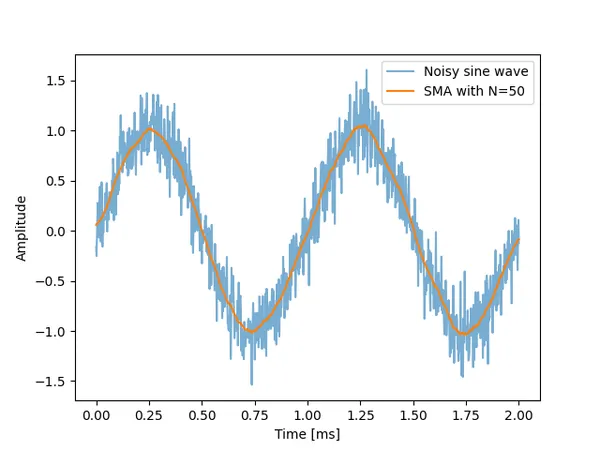 The below plot shows a noisy 1kHz sine wave (with random, normally distributed noise) and then the application of a SMA filter (symmetric, window size = 50) which does a commendable job at recovering the original signal: