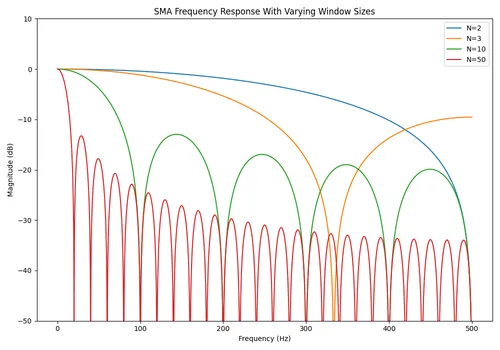 As expected, this shows us that at DC, the signal is not attenuated at all. As the frequency increases, the filter then begins to block more and more, until it lets through absolutely no signal at . This can be intuitively understood, because with a sampling frequency and a window size of , a single cycle of a signal would fit perfectly into the window. Since you take the average of all the values in the window, this top half of the signal would cancel out perfectly with the bottom half, giving no output. But then, as the frequency further increases, the filter begins to let through some of the signal, as shown by the side lobes. The next point of infinite attenuation is at , which is when 2 cycles of the signal would fit perfectly into the window. This cycle occurs all the way up to Nyquist at .