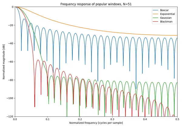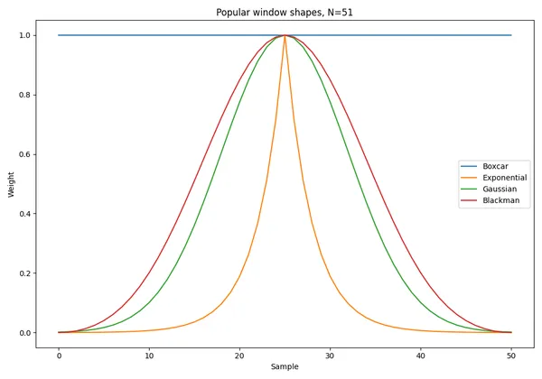 Stuck on what window shape to use? If a simple moving average won’t suffice in it’s simplicity, it might then depend on the frequency response you are after. Popular window shapes and their frequency responses are shown below. All the windows shown below are centered windows (and not left-aligned). The window sample weights are normalized to 1.