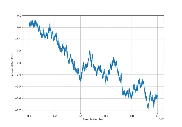 By the time the 10 million inputs have passed through the filter, the answer is wrong by about 0.6! This may or may not be a bad thing depending on your application. I guess (no proof!) that the average error will grow proportional to the square root of the number of samples pushed through the filter, similar to a random walk (drunkards walk).