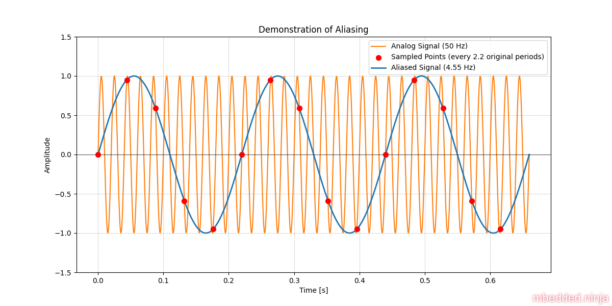 You can clearly see some really low frequency noise in this sampled signal. This is due to the aliasing effect. It might be worth touching on how aliasing works here. Explaining it in detail is beyond the scope of this article, but This is a placeholder for the reference: fig-aliasing-demonstration shows a demonstration of aliasing. The yellow line is the analogue signal, and the red dots are the sampled points by the ADC (we are sampling every 2.2 periods of the original signal, which is 22.7Hz). The blue line is the resulting “aliased” signal we would see in the digital domain.