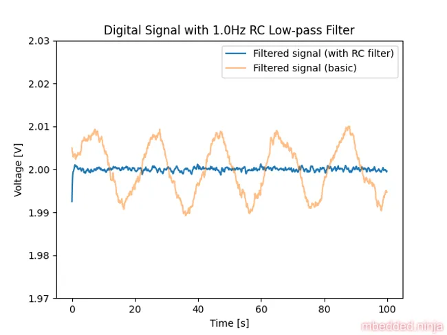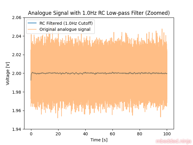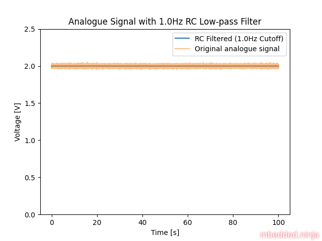 Let’s simulate the addition of a simple low-pass RC filter with the cut-off frequency of 1Hz to the analogue signal, before it enters the ADC. We choose a value of 1Hz so that is much lower than the Nyquist frequency of 5Hz (we have a 100ms sampling interval, which is 10Hz, so half the sampling frequency is 5Hz). This makes sure no really noticeable aliasing occurs.