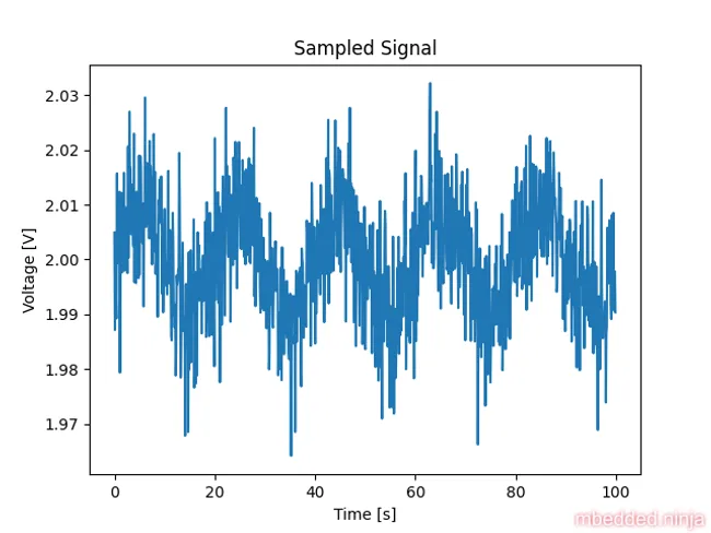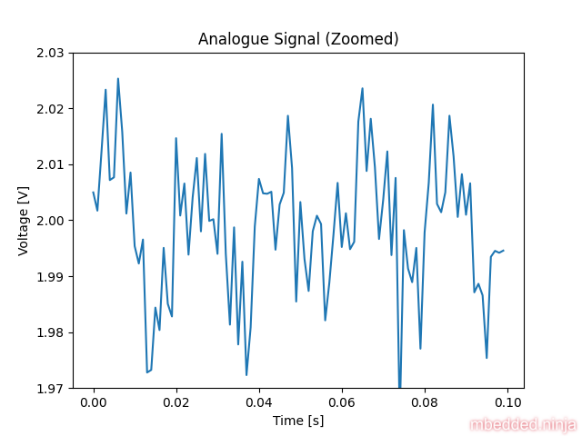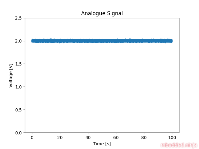 When we add the 2V output with the random noise and the mains noise, we get the signal shown in This is a placeholder for the reference: fig-analogue-signal. This is the signal in the analogue domain. This is the signal which the ADC will see and sample from.