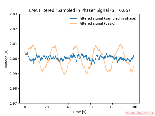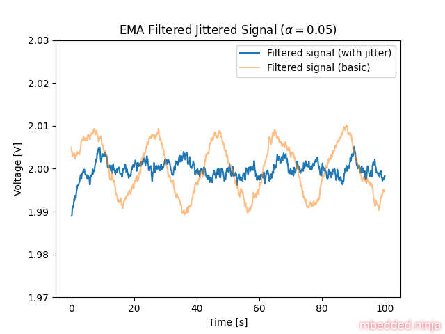 Let’s use the same EMA filter as before. This is a placeholder for the reference: fig-jittered-filtered-signal shows the signal after filtering. This is much better than with no jitter.