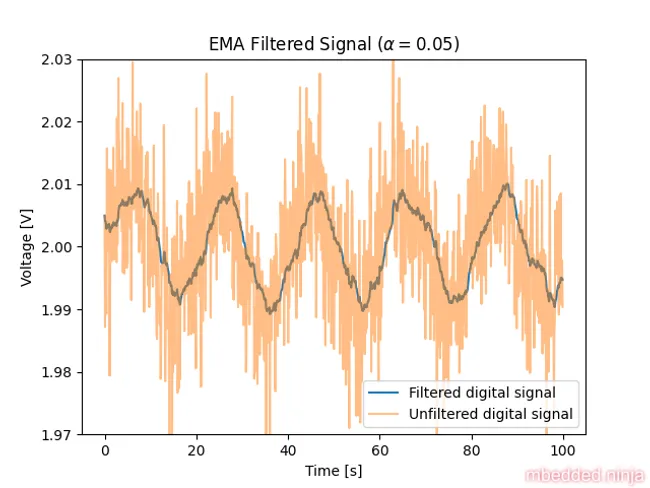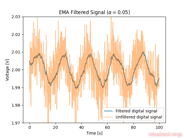 So now that we are in the digital domain, let’s try and filter out the noise. We have to solve this using firmware now, so we will use a simple EMA filter to do this (they are great little filters which don’t require a buffer and are cheap to compute). Let’s set and see what happens. This is a placeholder for the reference: fig-filtered-signal shows the signal after filtering.