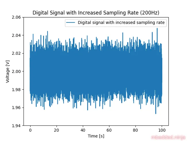 Let’s re-run the simulation, but this time sample at 200Hz (giving ourselves some healthy margin above Nyquist). This is a placeholder for the reference: fig-increased-sampling-rate-digital-signal shows the sampled digital signal after sampling at 200Hz.