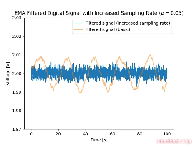 Now let’s filter this signal with the same EMA filter as before. This is a placeholder for the reference: fig-increased-sampling-rate-filtered-signal shows the signal after filtering.