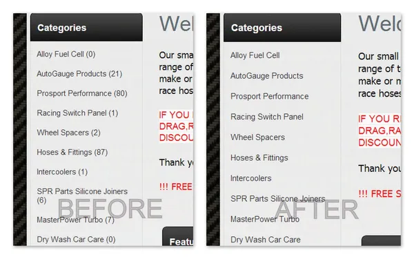 The following image shows the before and after when removing the product count from the categories on OpenCart’s front page.