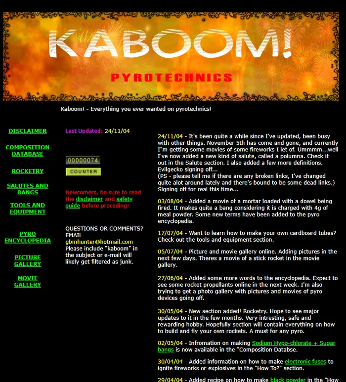 This blog started of called “Kaboom Pyrotechnics”. And yup, you guessed it, it solely contained information on how to make fireworks. It was initially designed in Microsoft Front Page and then in Dreamweaver. These were both WYSIWYG editors!