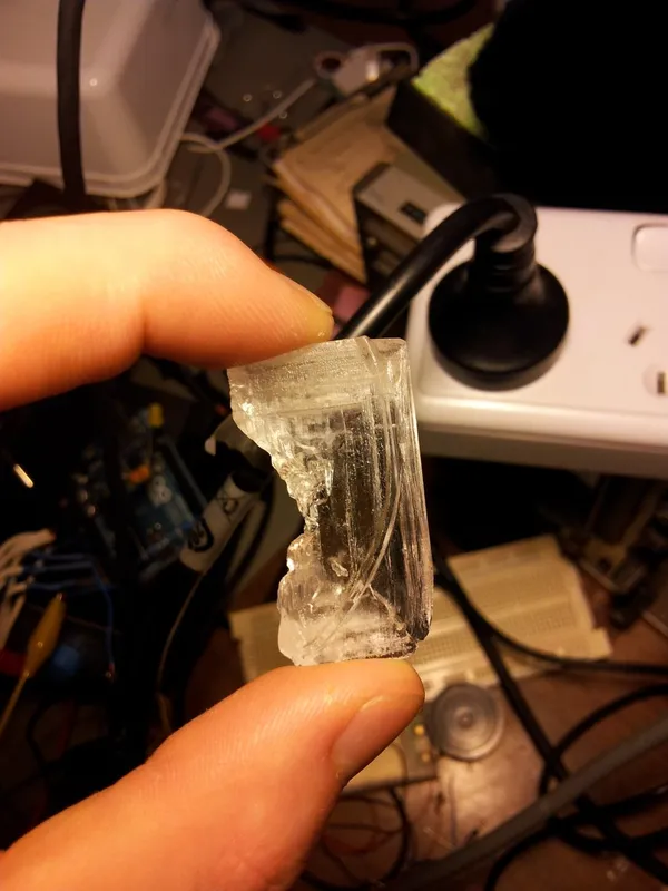 We managed to get about 50-60V generated across it when hitting it softly with the back of a screwdriver. Unfortunately we couldn’t get it to make any sound, this is probably harder to achieve due to getting the correct crystal shape (long and flat, I’m guessing) to make audible sound waves.