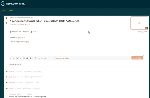 I posted a link to the A Comparison of Serialisation Formats page to the /r/programming subreddit. I got a decent amount of feedback which helped improve the page and fix mistakes.