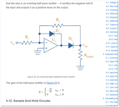 Added info, schematics and equations for op-amp based ideal diodes and half-wave rectifiers.