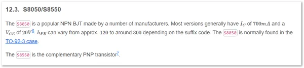 - Added info on the popular S8050 NPN BJT to the Bipolar Junction Transistors (BJT) page.
