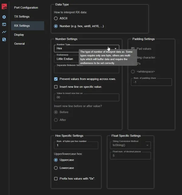 NinjaTerm can now display numerical data types such as hex, uint8, uint16, float32, e.t.c.: