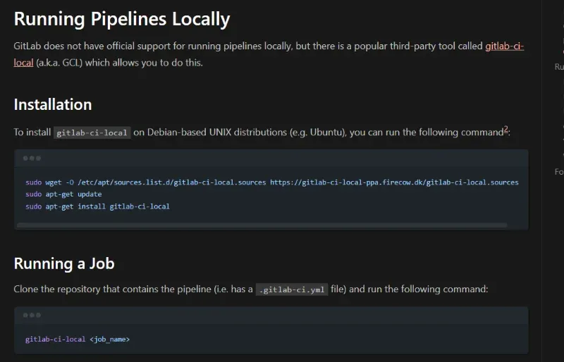 Added information on how to run GitLab pipelines locally using the gitlab-ci-local tool.